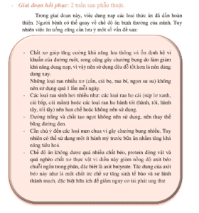 TS.BS Đỗ Tất Thành – Trưởng khoa Dinh dưỡng, Bệnh viện Hữu nghị Việt Đức cho biết: Dinh dưỡng của bệnh nhân xuất viện sau khi cắt bỏ đại tràng nhanh chóng trở về bình thường, tuy nhiên cũng cần lưu ý đến chức năng tiêu hoá, hấp thu và khả năng giảm sút các loại vitamin do phẫu thuật. Vì vậy ở giai đoạn này cần chú ý tới việc cung cấp năng lượng và các chất dinh dưỡng đầy đủ nhằm phòng ngừa sự thiếu hụt trong giai đoạn sau. Nhu động ruột có thể thay đổi, một số bệnh nhân có thể bị tiêu chảy, tình trạng táo bón thường hiếm gặp và nguy hiểm hơn.