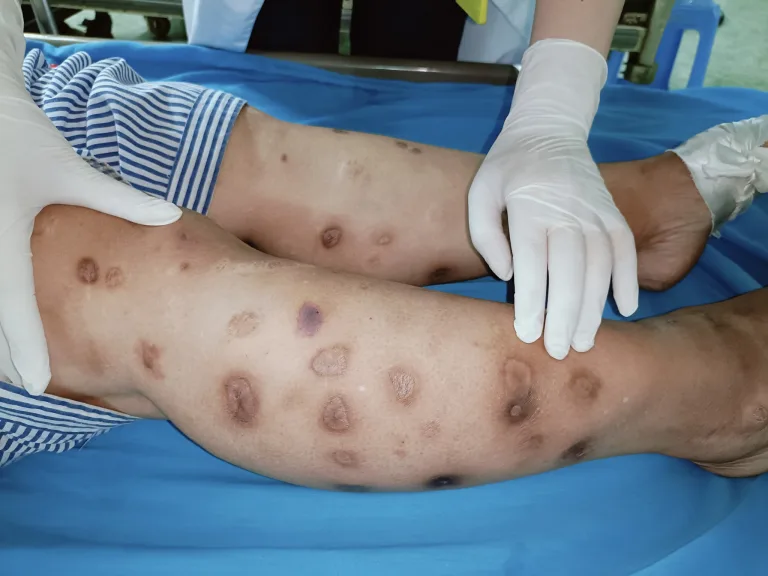 Sau tiêm, các nốt tiêm xuất hiện đốm đỏ nâu, thâm đen, dần dần, các nốt tiêm đã hình thành các nốt sẹo, hoại tử chi chít ở tay và chân.