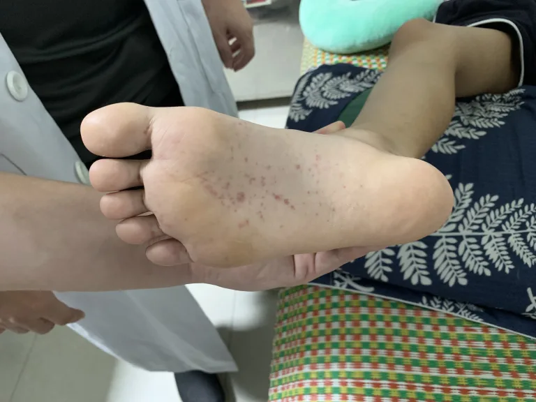 Những vết phát ban có màu tím, trông như vết bầm tím. Đây là dấu hiệu đặc trưng và phổ quá nhất của bệnh. Phát ban chủ yếu phát triển trên mông, chân và bàn chân (có một số trường hợp xuất hiện trên mặt, cánh tay và thân).