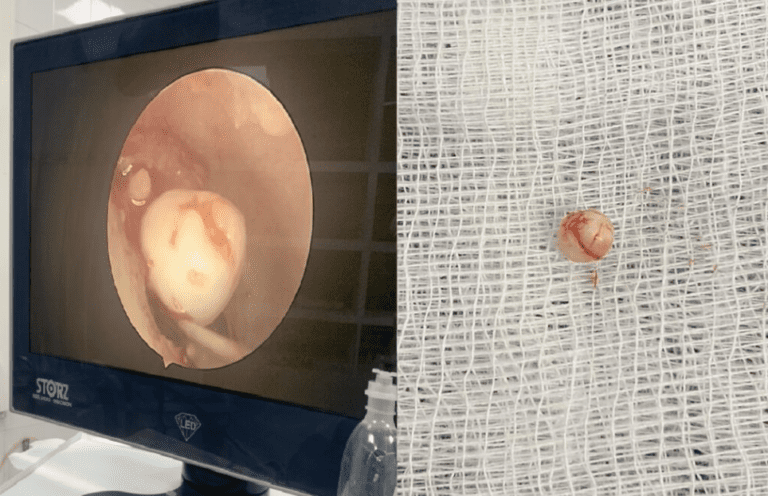 Trước đó, trong quá trình thăm khám và nội soi tai, bác sĩ phát hiện có khối màu trắng như hạt ngọc trai nằm sau màng nhĩ ở vị trí góc trước dính vào cán búa hòm tai phải. Tuy nhiên hòm tai không có dịch, bệnh nhi không hề có triệu chứng chảy mủ tại tai hay tiền sử phẫu thuật trước đó.