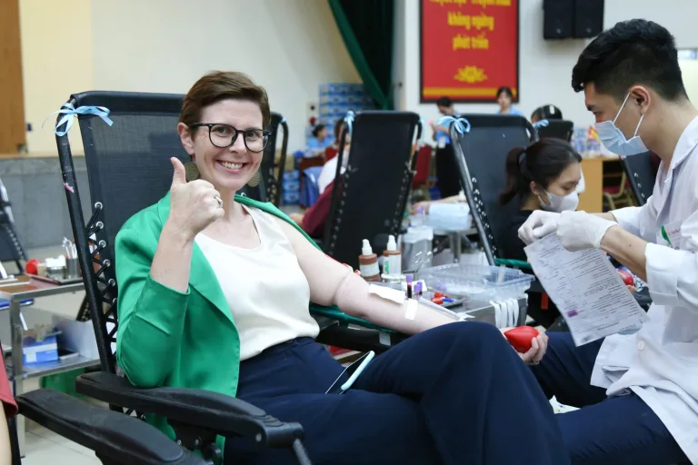 Chia sẻ cảm xúc khi lần đầu tiên tham gia hiến máu tại Việt Nam, TS. Angela Pratt cho biết: “Tôi đã tham gia hiến máu khoảng 10 lần tại Úc nhưng đây là lần đầu tiên tôi hiến máu tại Việt Nam. Tôi rất hạnh phúc khi được tham gia hiến máu ở Viện ngày hôm nay cùng với rất đông người dân đến tham gia hiến máu, trong số đó có khá nhiều các bạn trẻ.”